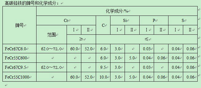 產(chǎn)品概述:        高碳鉻鐵主要用于不銹鋼生產(chǎn),其中200系不銹鋼含鉻量約在16%,300系不銹鋼含鉻量約在25%,400系不銹鋼含鉻量約在14%